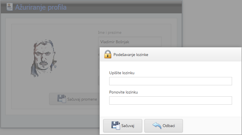 Ukoliko želite da promenite vlastitu lozinku kliknite na dugme [Izmeni lozinku] i dva puta upišite istu lozinku. Nije stavljena nikakva provera, lozinka može biti dugačka od 1 do 128 karaktera, ali morate nešto upisati kao lozinku.