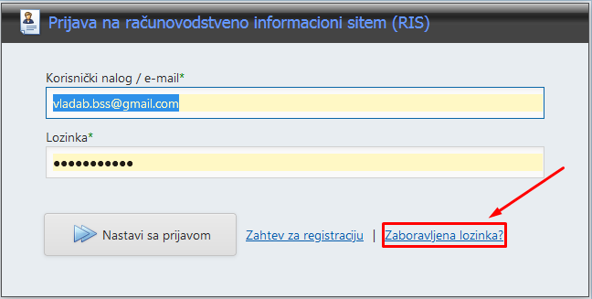 Ukoliko ste zaboravili lozinku ili se prvi puta prijavljujete biće dovoljno da kod predstavljanja kliknete na link [Zaboravljena lozinka?] i sistem vas prebacuje na drugu ekransku formu.