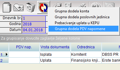 Kupci, dobavljači, magacinsko i maloprodaja - Za raziku od blagajničkog u ovim aplikacijama navedena opcija se nalazi u glavnoj formi i označavaju se zaglavlja a ne stavke. Tako da u svim označenim dokumentima pridružujete pdv napomene svim pripadajućim stavkama tog dokumenta.