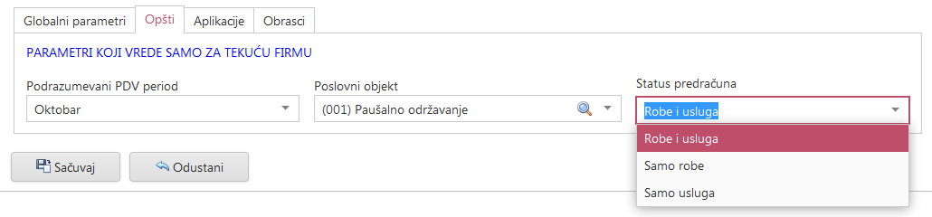 Obzirom da većina firmi ima potrebu samo za predračune robe a drugi samo za predračune usluga, napravljena je mogućnost sakrivanja jednog ili drugog. Konkretno ako ste firma koja izdaje samo predračune usluge, iritirajuće je da vam se u aplikaciji vidi i tabela sa artiklima koja je za njih nepotrebna, zauzima prostor na ekranu i odvlači pažnju. U vezi toga u parametrima imate mogućnost da na nivou firme odabere neke od statusa predračuna. Kao što vidite na slici dole.