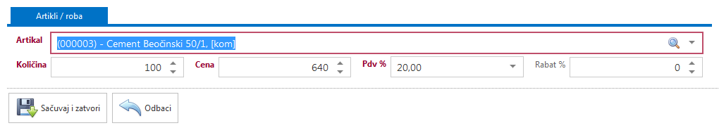 Novu stavku za robu otvarate kada kliknete na dugme u iznad table sa stavkama robe u meniju [Novi] a postojeći tako da kliknete na ikonu [Izmeni] koja se nalazi na početku stavke koje menjate. Prvo dobijete ekran gde se nalaze sledeća polja:- Artikal - Kucate naziv artikla ili šifru artikla i to najmanje 3 karaktera kako bi započela pretraga za artiklom. (Obavezan podatak)