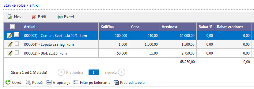 - Artikal- Šifra, naziv i merna jedinica artika.