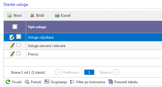 U tabeli za unos i ažuriranje usluga vidljiva polja su:- Kolona za manipulaciju