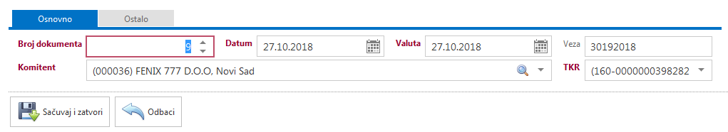 - Broj dokumenta - Označava osnovni broj dokumenta ili redni broj predračuna u tekućoj godini.