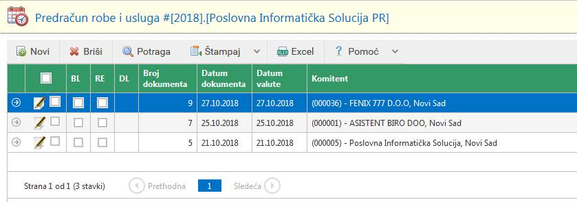 - RE - Dokument je realizovan / nerealizovan. Ovde se podrazumeva da dokument štiklirate kao realizovan ako je izvršeno plaćanje na osnovu njega.