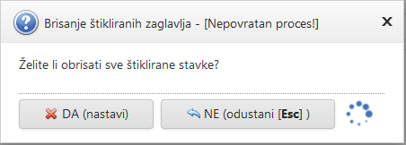 Unos - Klikom na dugme [Unos] program otvara formu za unos novih podataka koji su prikazani u tabeli. Ispravka - Klikom na dugme [Ispravka] program otvara formu za ažuriranje postojećih podataka stavke na kojoj se trenutno nalazite. Ako se ne nalazite ni na jednoj stavki, ovo dugme je onemogućeno, sve dok ne kliknete na određenu stavku kako bi program znao koju stavku želite ispravljati. Brisanje - Sve redove koje želite brisati u tabeli morate ih prvo štiklirati. Nakon što ste kliknuli na dugme [Briši] Pojavi vam se dijalog za brisanje. Ukoliko ste sigurni klinite na dugme (DA) ako niste na dugme (NE) ili pritisnite tipku [Esc] na tastaturi. PAŽNJA! Brisanje je nepovratan proces nakon čega nije moguće povratiti obrisane stavke.