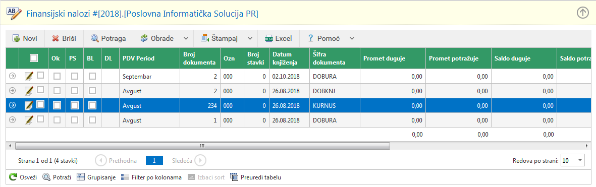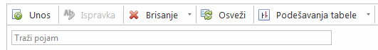 Štampaj - Ukoliko u programu postoje definisani izveštaji, biće vam prikazane sve opcije za štampanje. Napominjemo da se svi izveštaji generisani za štampanje konvertuju u PDF koji vidite na ekranu i na vama je da li želite samo gledati izveštaj, odštampati ili takav PDF preuzeti na svoj računar. Obrade - Ukoliko u programu postoje potreba za određenim obradama, biće vam prikazane sve opcije za obradu. Napominjemo da redovi nad kojima se vrši obrada moraju u principu biti štiklirani, osim ako to nije drugačije definisano. Osveži - Ova opcija služi da se osveži tabela ako za to ima potrebe, naime to je slučaj ako ste sigurni da još neko od korisanika pristupa istim podacima pa da vidite eventualne izmene od strane drugih korisnika koje su se desile u među vremenu. Podešavanje tabele - Ova opcija ima u sebi tri podopcije (slika dole). Moramo