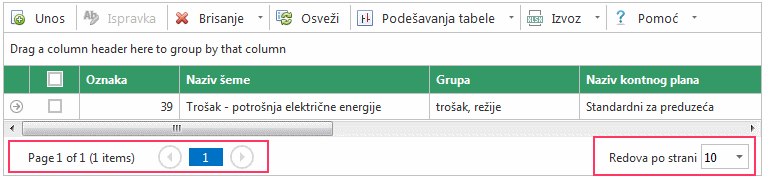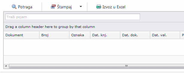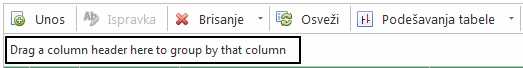 - Prikaži okvir za grupisanje – Kada imate potrebu da tabelu grupišete na osnovu jedne ili više kolona, tada aktivirajte navedenu opciju. Na vrhu tabele prikaže se okvir u koji strelicom miša dovučete željeno zaglavlje kolone. Kada ne želite grupisati podatke tada samo iz navedenog okvira vratite kolonu u tabelu.