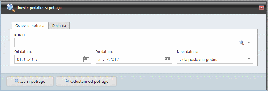 Kada u programu za izveštaje kliknete na dugme za pretragu otvara se forma kao na slici gore sa svim parametrima za filtriranje i kreiranje izveštaja. Forma može imati TAB-ove kao na gore prikazanoj slici, gde se upisuji dopunski parametri. Klikom na dugme [Izvrši potragu] izvršava se upit i kreira se izveštaj koji možete videti u tabeli programa u kome se nalazite. Klikom na dugme [Odustani od potrage] zatvarate formu za potragu i vraćate se na pretnodno stanje.