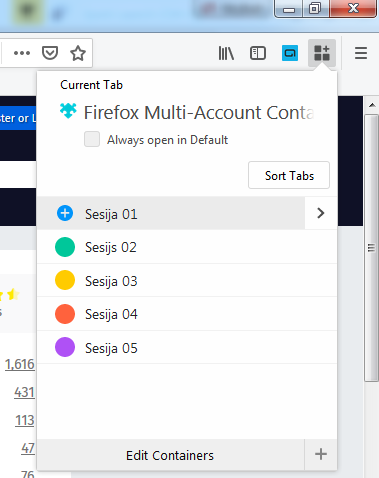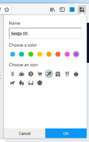 Nakon toga se pojavi ikona u gornjem desnom uglu Firefoxa, na koju kada kliknete možete odabrati sesiju u kojoj želite da radite i u okviru koje ste zaštićeni od razmene podataka sa drugim sesijama. Kada kliknete na određnu sesiju otvori vam se novi TAB.