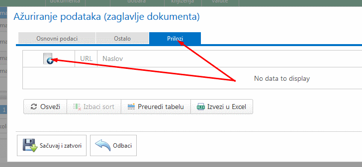 - Kod unosa zaglavlja postoji jezičak „Prilozi“ kada kliknete na njega otvori se tabela za unos dodatnih priloga. To mogu biti skenirani dokumenti, word, excel itd.