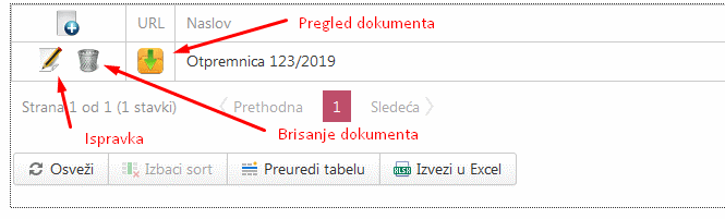 Kada ste uneli „NN“ dokumenata, u tabeli imate mogućnost da ispravljate, brište ili pregledate dokumente.